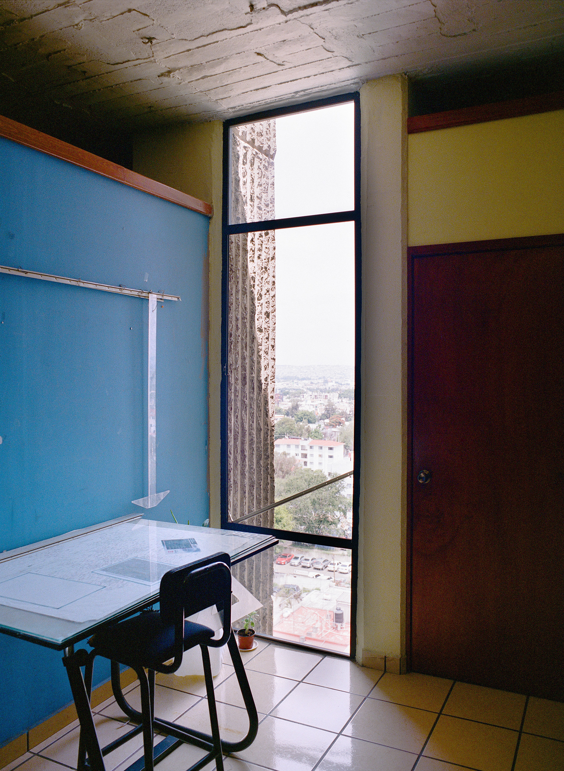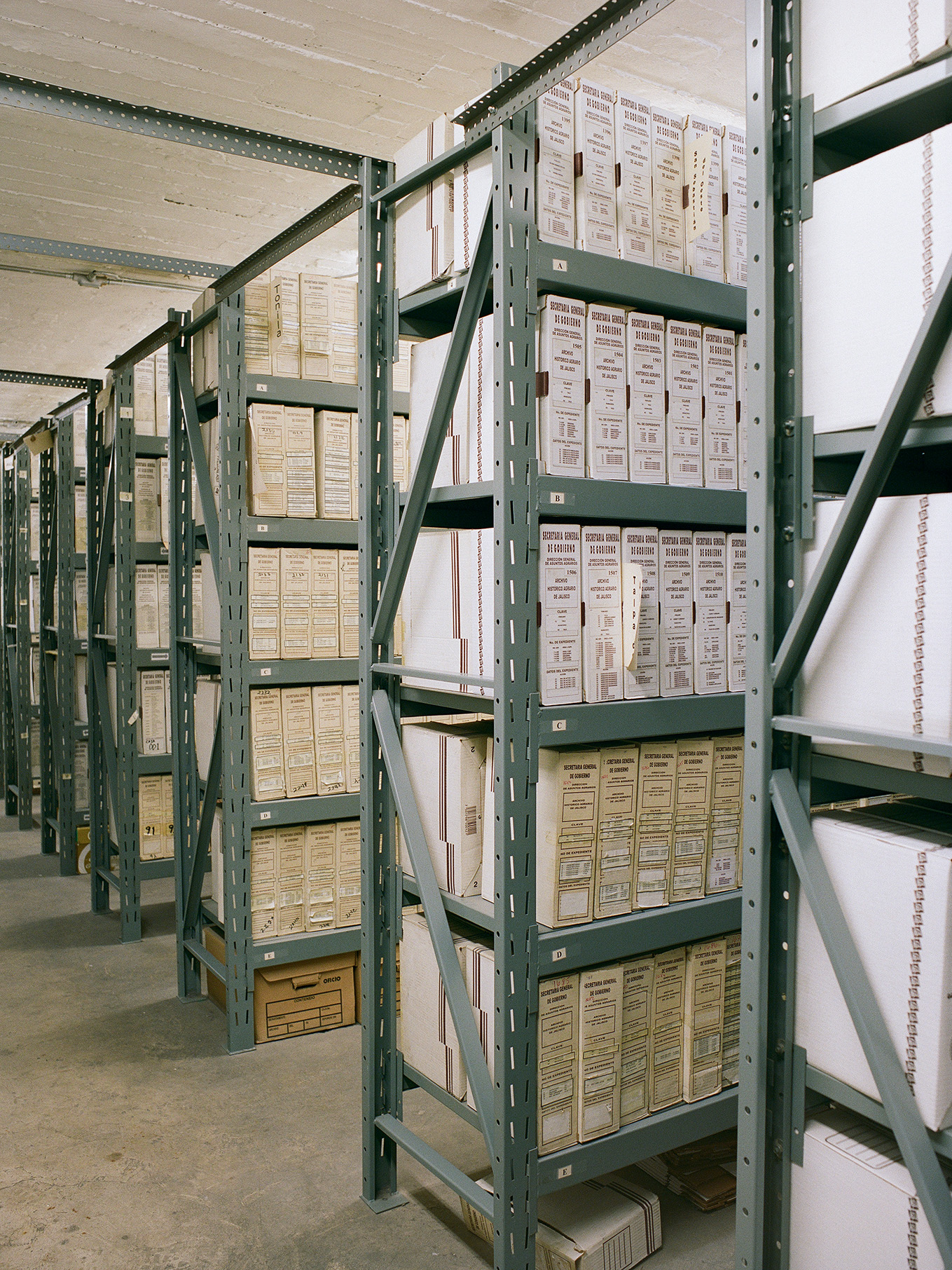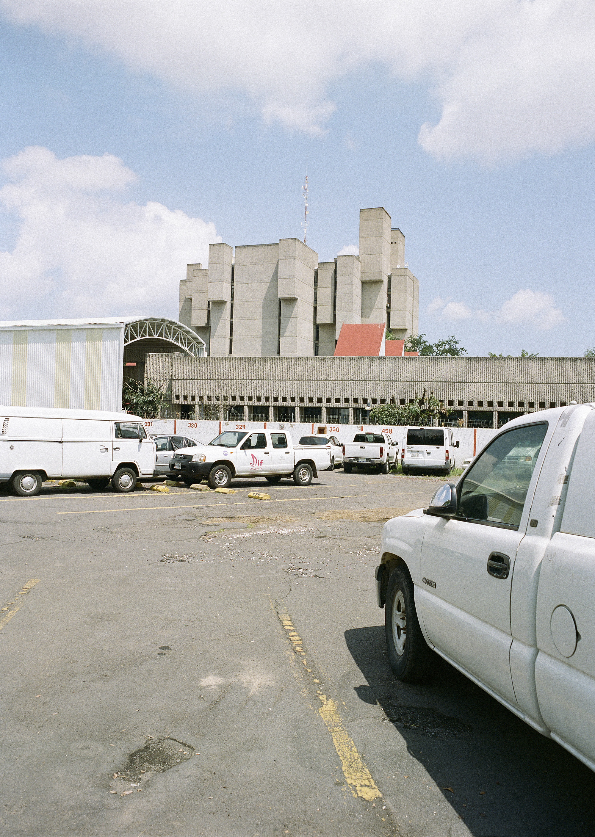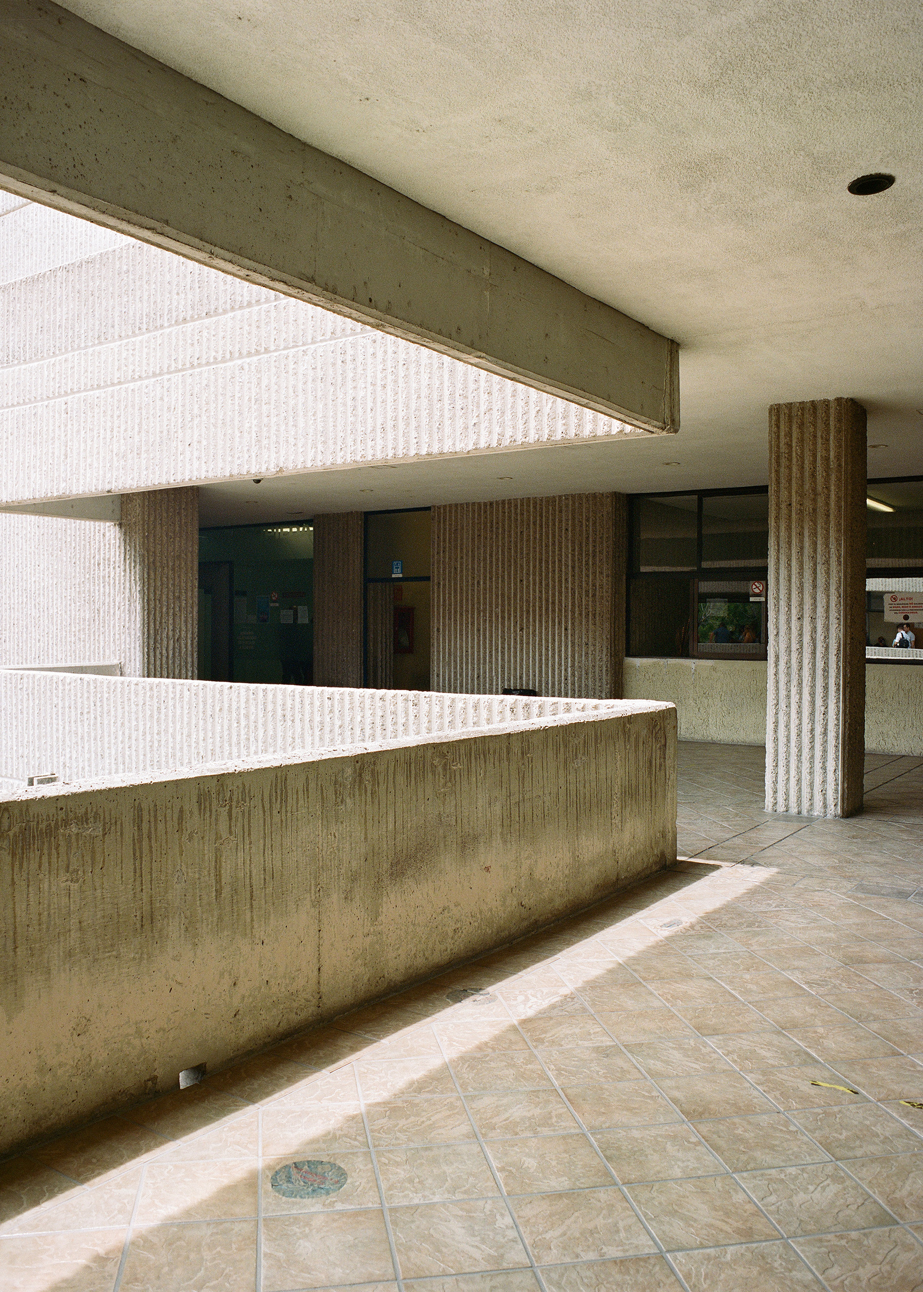 Alejandro Zohn's largest building is striking even from a distance, towering over a low residential neighbourhood like a concrete castle. Everyone in Guadalajara has been to El Archivo, as a visit is required for registering for example a birth, marriage, or death. The inner courtyard always teems with people and street vendors set up shop outside in the shade of the brutalist blocks. Most of the building itself is closed to the public, but thanks to welcoming staff it was possible to get a glimpse of the municipal offices and archives, which contain urban plans, newspapers, and most other records of Guadalajara's history. Zara Pfeifer took her analogue series „El Archivo“ during a five days stay in September 2022.