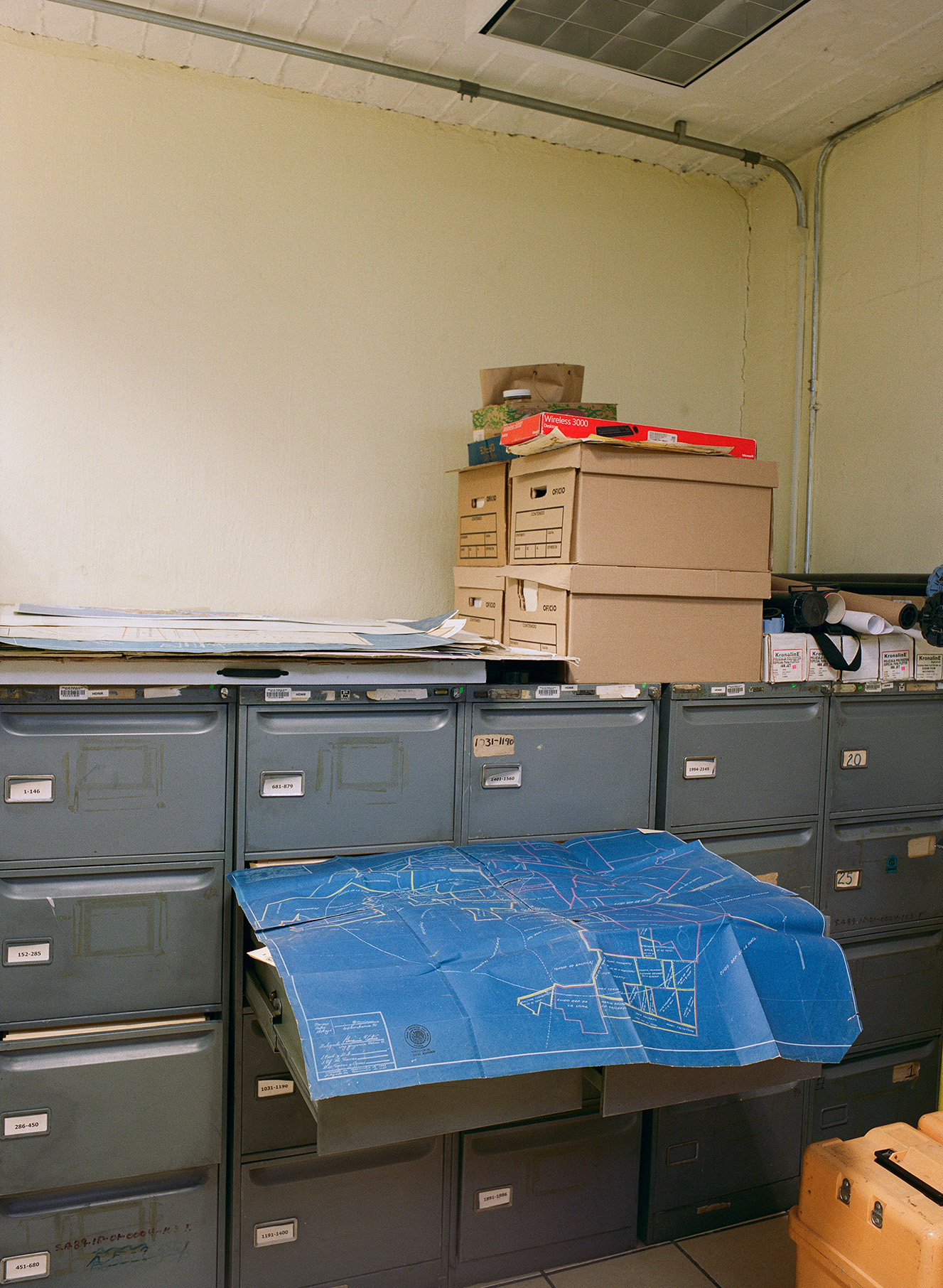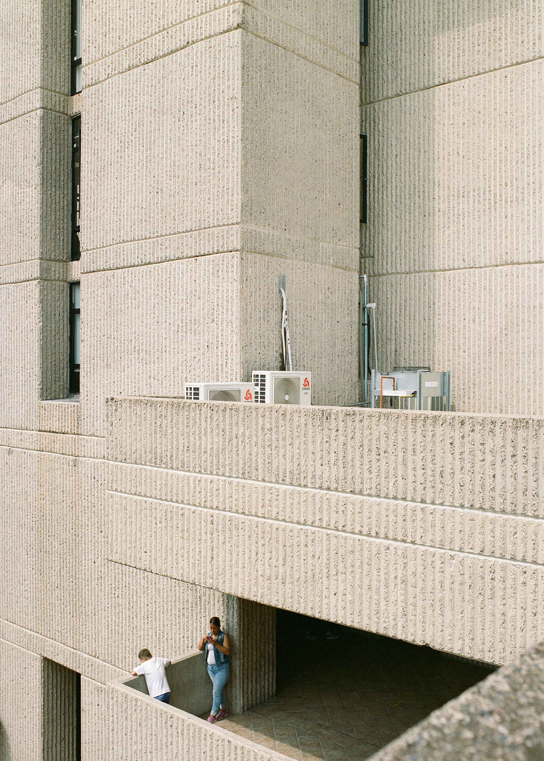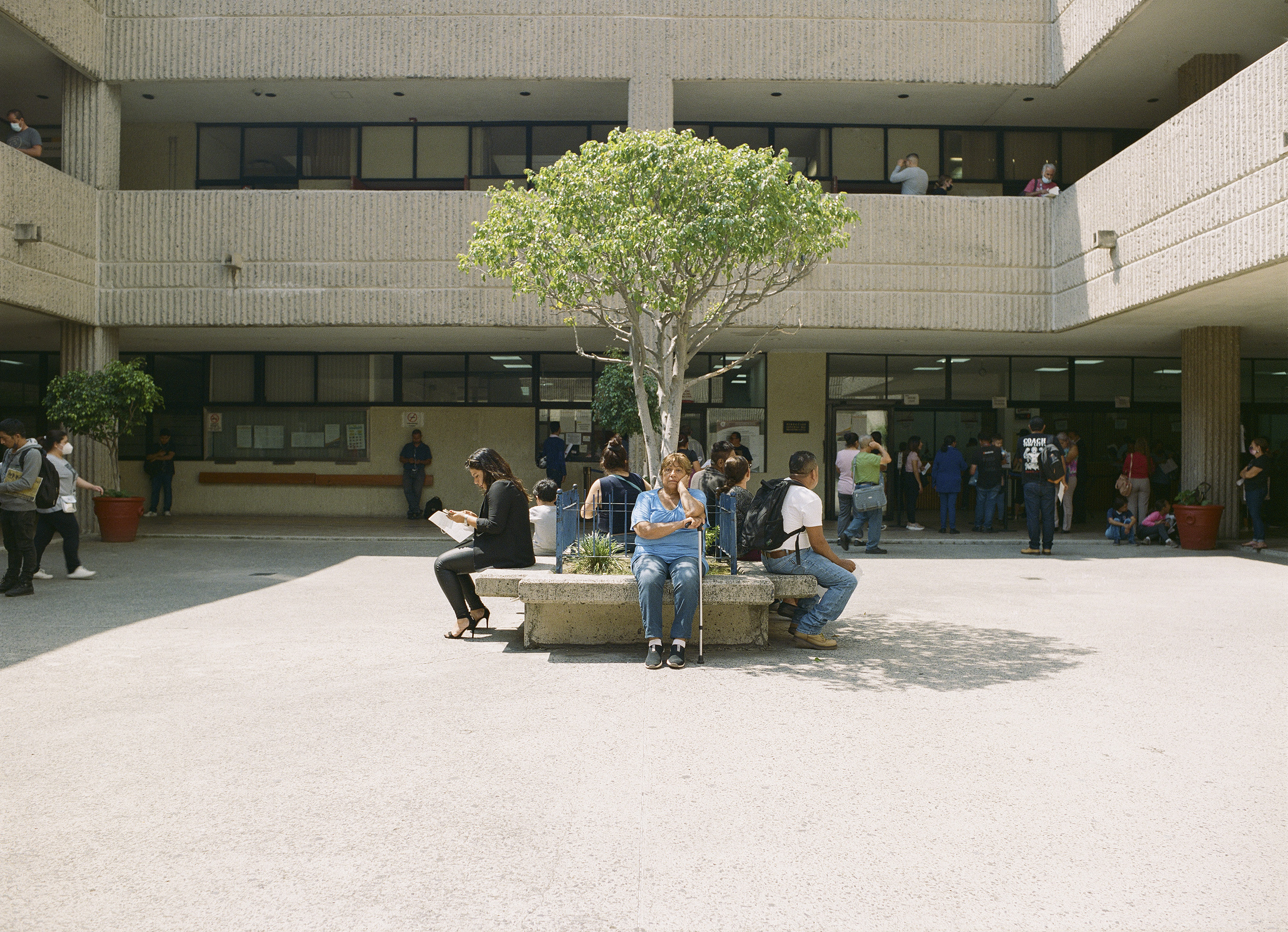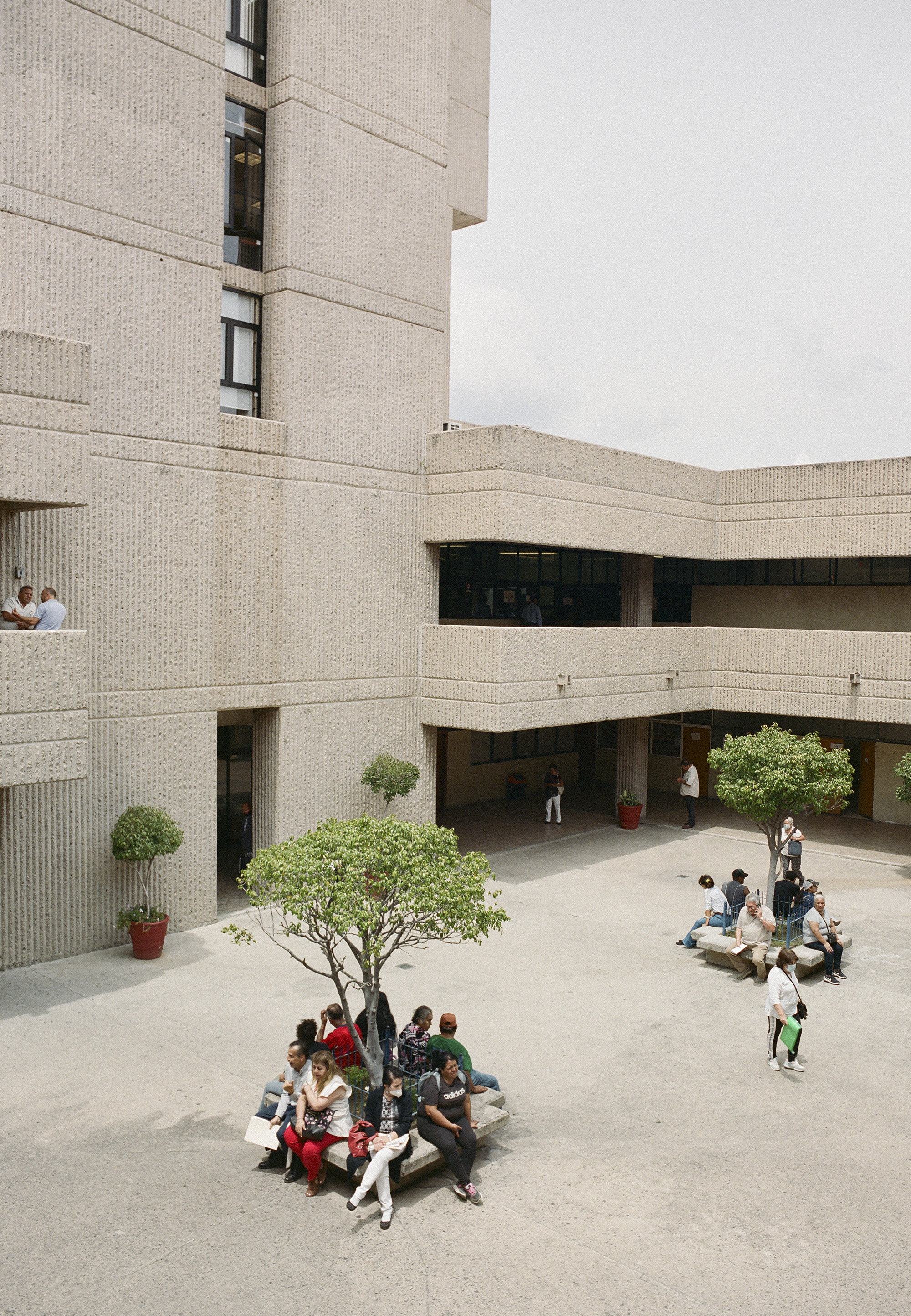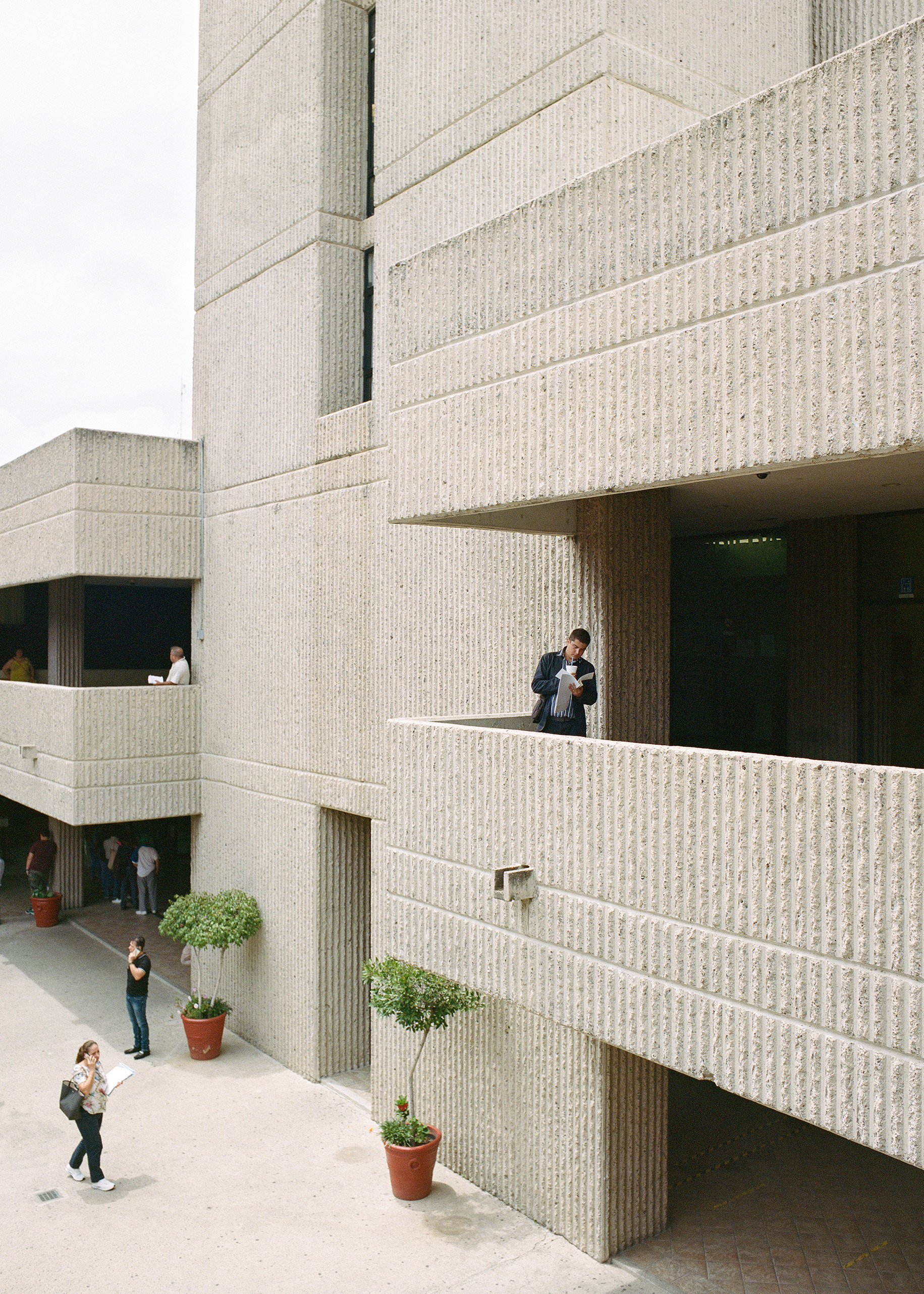 Alejandro Zohn's largest building is striking even from a distance, towering over a low residential neighbourhood like a concrete castle. Everyone in Guadalajara has been to El Archivo, as a visit is required for registering for example a birth, marriage, or death. The inner courtyard always teems with people and street vendors set up shop outside in the shade of the brutalist blocks. Most of the building itself is closed to the public, but thanks to welcoming staff it was possible to get a glimpse of the municipal offices and archives, which contain urban plans, newspapers, and most other records of Guadalajara's history. Zara Pfeifer took her analogue series „El Archivo“ during a five days stay in September 2022.