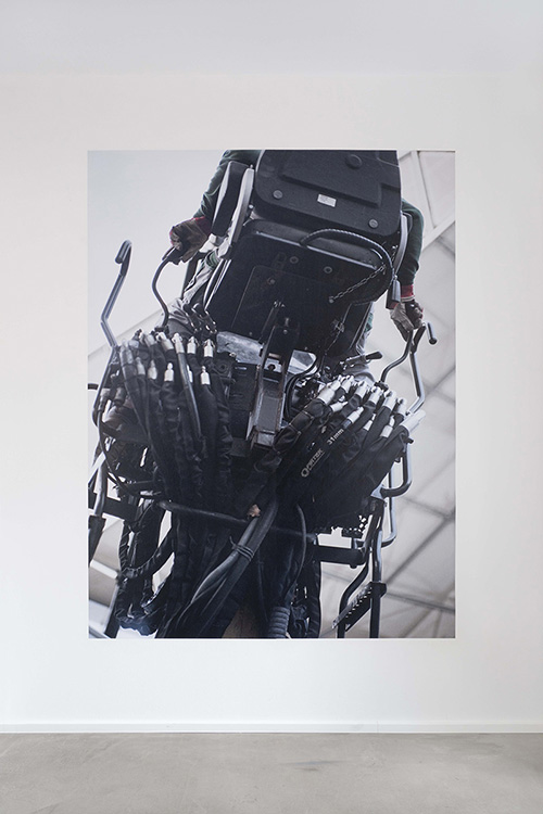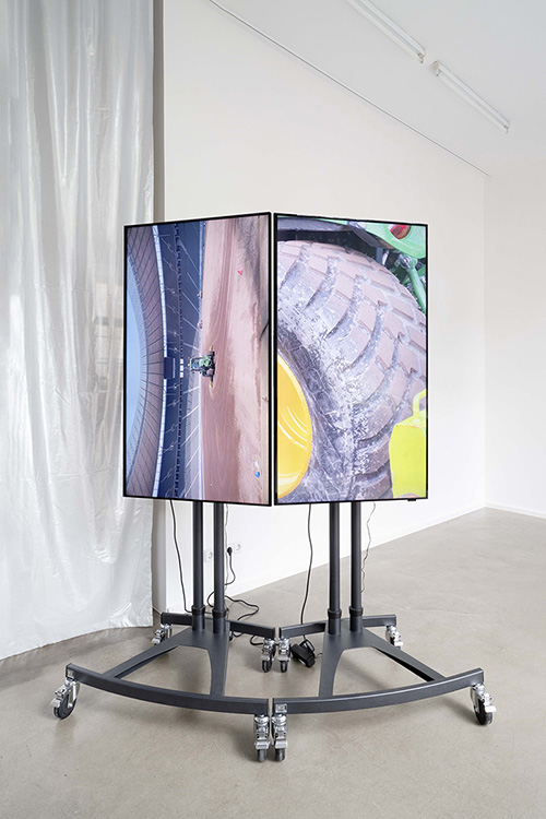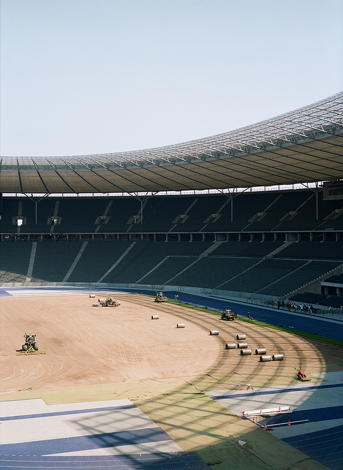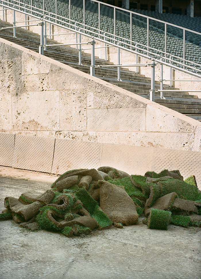 In July 2022 and January 2023, Zara Pfeifer documented the replacement of the 8.000 m2 football pitch at Olympic stadium in Berlin. The sod to cover the pitch and the necessary working machines need 30 trucks and are transported over 600 km from Slovakia to Berlin. Rollrasen is a series of photographs and video sequences in which Pfeifer shows the process of removal, preparation, replacement and recycling of the grass in what appears as a commentary on our globally networked economy in all of its physical consequences.